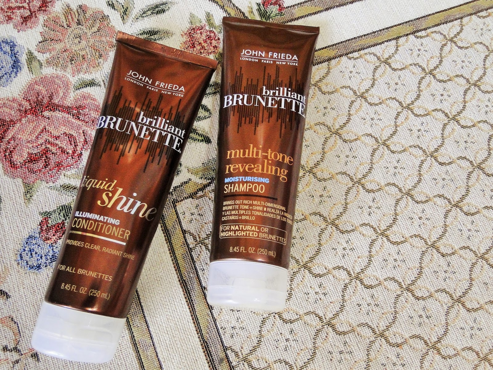 O shampoo e condicionador que eu uso são da John Frieda, da linha especial para morenas Brilliant Brunette. O Multi-tone Revealing Moisturizing shampoo tem ação hidratante e também ajuda a criar um cabelo mais tridimensional destacando mechas mais claras ou mais escuras. Já o Liquid Shine Illuminating Conditioner possui outro foco: dar brilho ao cabelo - tanto é que tem até "glitter" visível quando você aperta o produto pra usar!